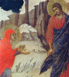 「七日的第一日清早,天還黑的時候,抹大拉的馬利亞來到墳墓那裡,看見石頭從墳墓挪開了。. . . 門徒離開後,馬利亞仍留在墳墓外哭泣。她低頭往墳墓裡看,見兩位天使坐在耶穌的身體曾放置的地方。天使問她為何哭泣,她回答說:「因為有人把我主挪了去,我不知道放在哪裡。轉身之際,她看見耶穌站在那裡,但起初未能認出祂,以為是園丁。​當耶穌呼喚她的名字「馬利亞」時,她才認出是主,並稱祂為「拉波尼」(老師)。」(約20:1, 11-16)​ ​