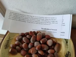 諾里奇的茱莉安(Julian of Norwich, 約 1342–1416)是一位中世紀的靈修師傅,「Julian」並非她的本名,Julian 乃是來自她隱修小室所依附的聖茱莉安教堂(St Julian’s Church)。茱莉安寫了一本巨著 一《神愛的啟示》(Revelations of Divine Love),記載了她在禱告中所見的異象。她在書中常以「注視」(beholding)來描述禱告,禱告不是分析,而是用心靈的眼睛凝望,凝望著那位身懸十架的耶穌。茱莉安在一次默想中,她將一個「像榛子般大小的東西」放在手上,凝望著它。她驚訝於它的渺小,並想知道那是什麼。隨即得到了答案:「它是受造之物。」她意識到,它是如此微小和脆弱,似乎隨時都可能消失或破碎,但神對她說:「它能存留,且永遠長存,因為神愛它。」接著,她領悟到三個真理:「神創造了它,神愛它,神保存它。」