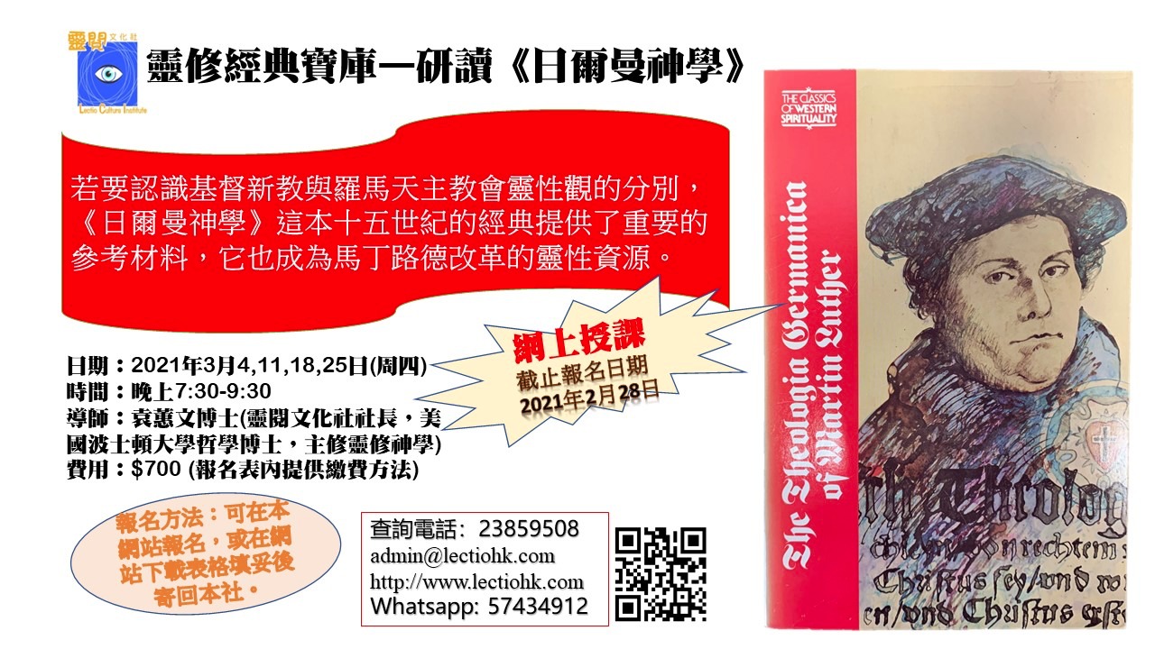 2021年《日爾曼神學》(Theologia Germanica)—認識馬丁路德的 靈修觀 活動詳情 This event finished on 25 3 月 2021 Categories: 課程 網上報名表:https://forms.gle/7hpRWbELk8KAukZr9