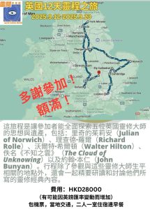 英國靈修大師足跡之旅 你對這幾位靈修大師有多少認識呢? 活動詳情 Date: 9 月 12 – 23, 2025 Categories: 靈修傳統, 靜修營 Tags: 靈修傳統 這旅程是讓參加者能全面探索五位英國靈修大師的思想與遺產,包括: 里奇的茱莉安 (Julianof Norwich)、 理查德•羅爾(Richard Rolle)、 沃爾特•希爾頓(Walter Hilton)、 佚名《不知之雲》(The Cloud of Unknowing), 以及約翰•本仁 (John Bunyan).。 行程除了參觀與這些靈修大師生平相關的地點外, 還會一起精要研讀和討論他們所寫的靈修經典內容。