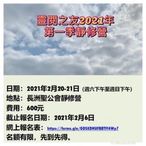2021年2月20-21日季度退省 活動詳情 Date: 2 月 20 – 21, 2021 Categories: 靜修營 網上報名表: https://forms.gle/GDSKDHUFBBTFf4Wp7 費用:$600- 地點:長洲聖公會靜修舍